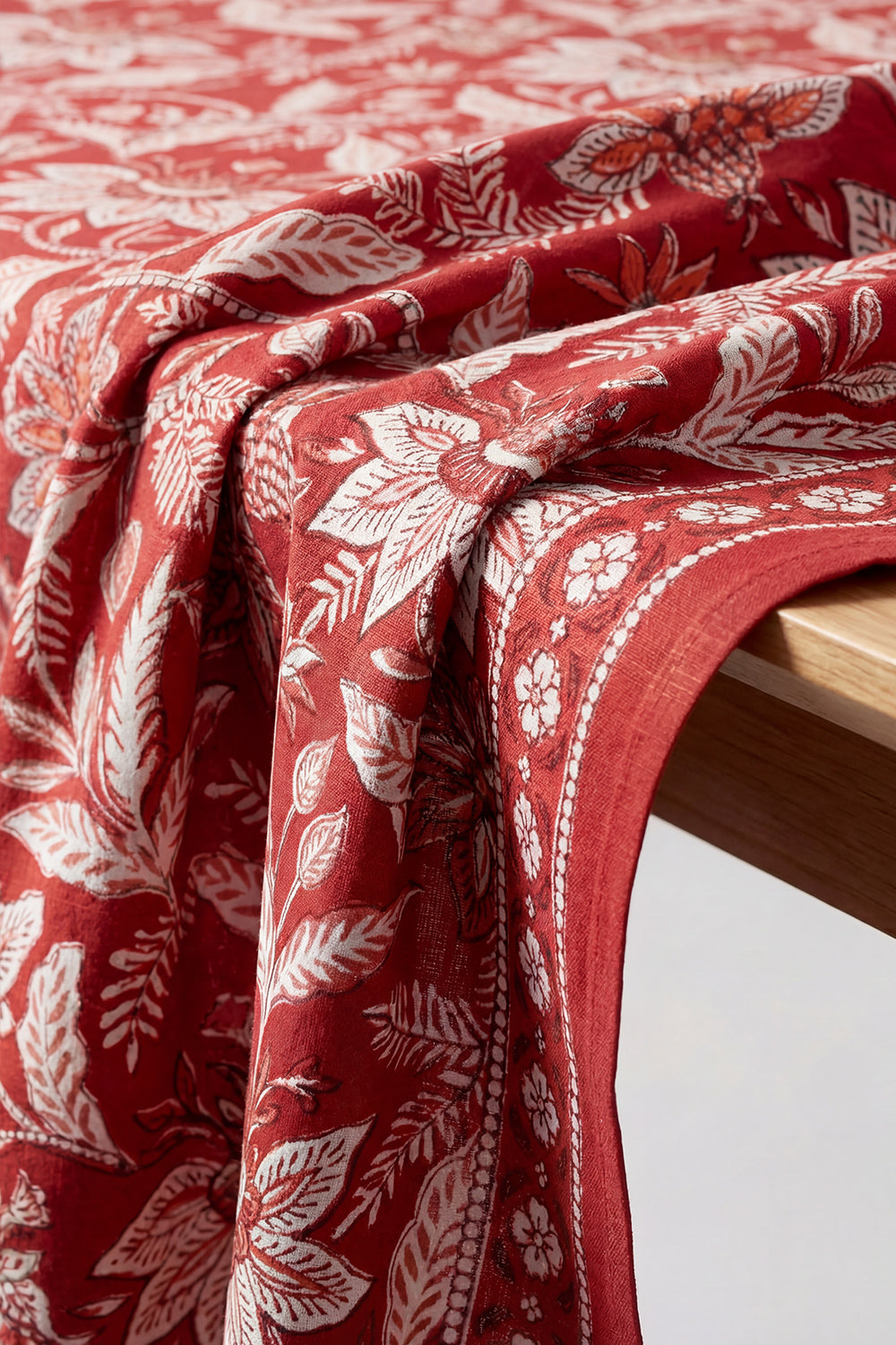The Hibiscus tablecloth is delicately crafted by artisans using a traditional hand block printing technique.