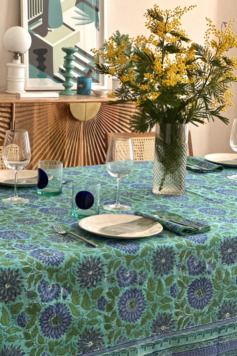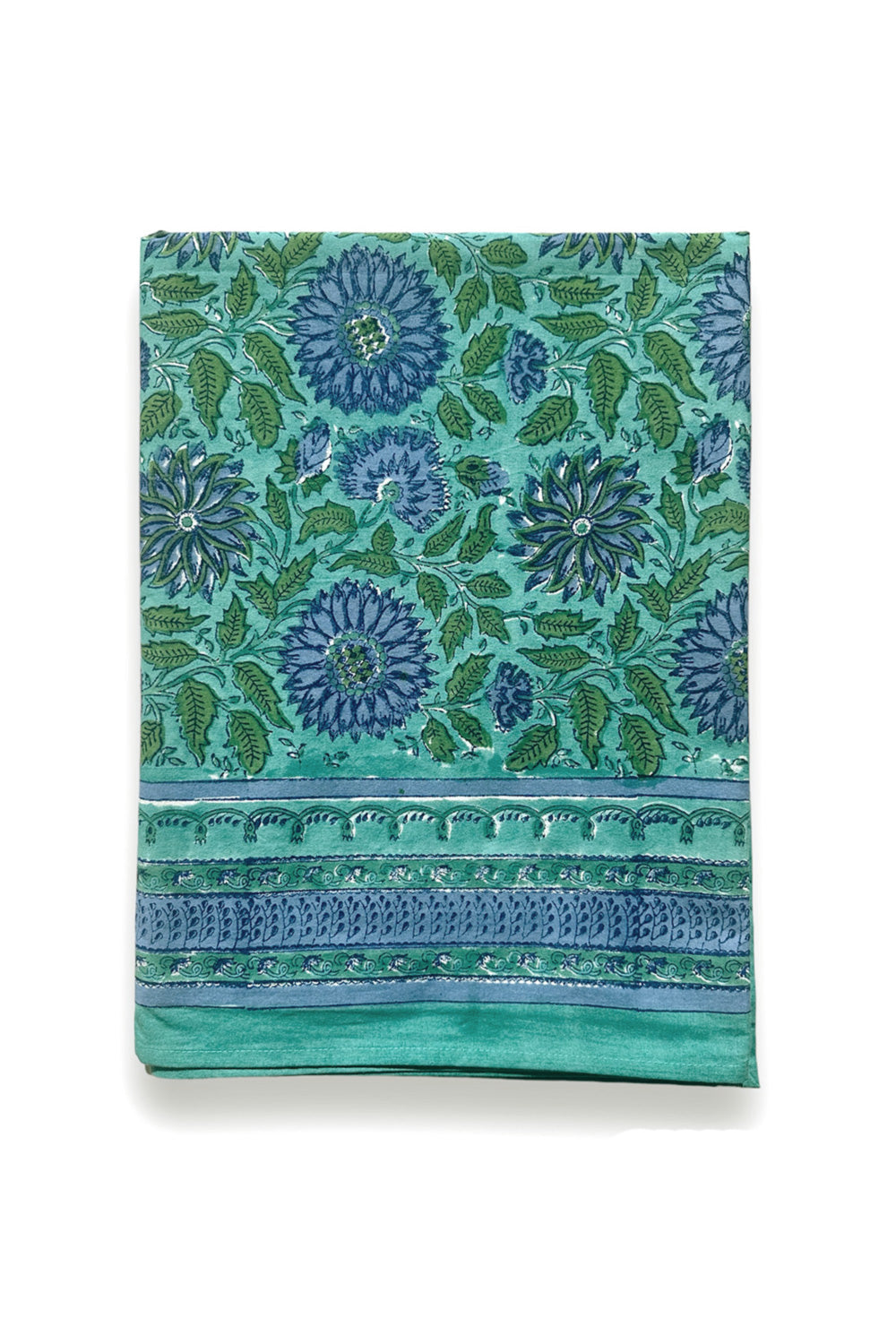 The Rhapsody tablecloth is delicately crafted by artisans using a traditional hand block printing technique.
