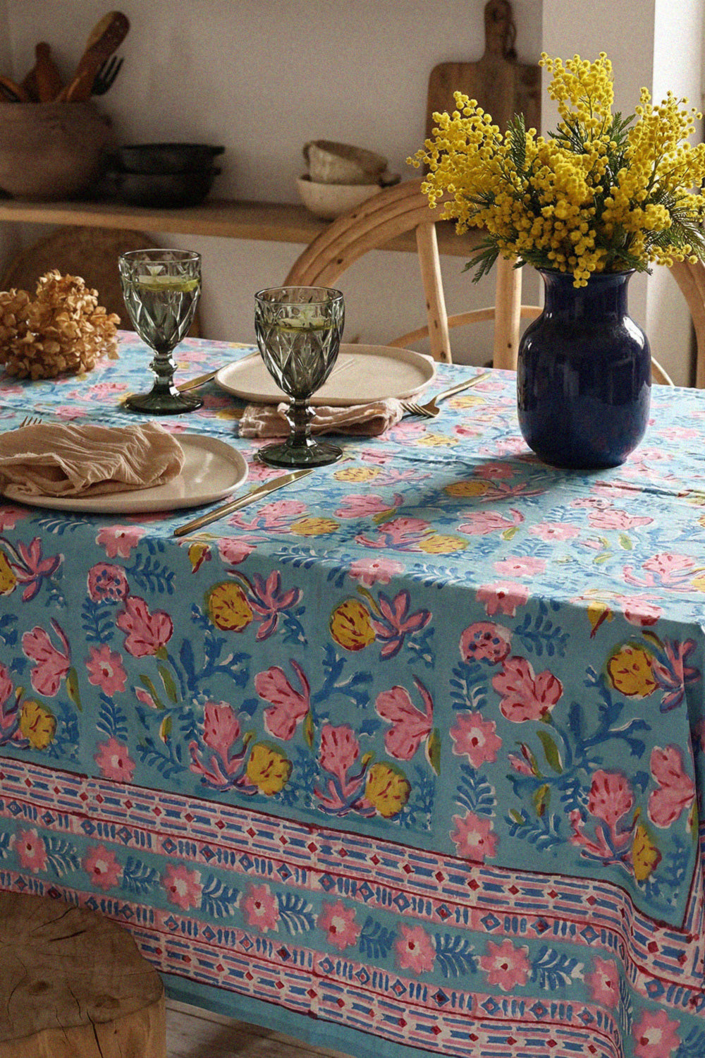 La nappe Waterlily , élaborée avec soin par nos artisans, est le fruit d'un savoir-faire ancestral incarné par la technique du block print, réalisée à la main avec délicatesse. Sur ce tissu en coton, les couleurs s'épanouissent, invitant à des instants de bonheur partagés autour de la table.